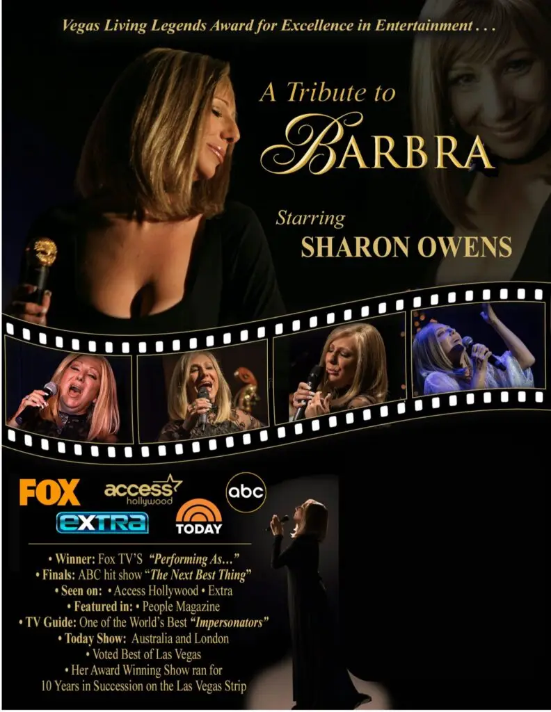 Experience the voice, glamour, and storytelling of Barbra Streisand through Sharon Owens, a world-class tribute artist and Las Vegas headliner seen on Legends in Concert, FOX, and ABC.